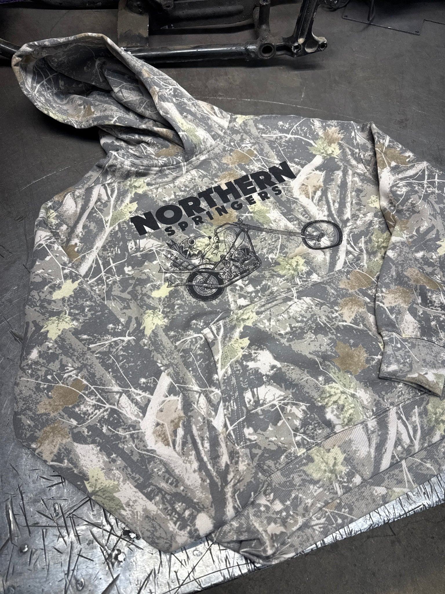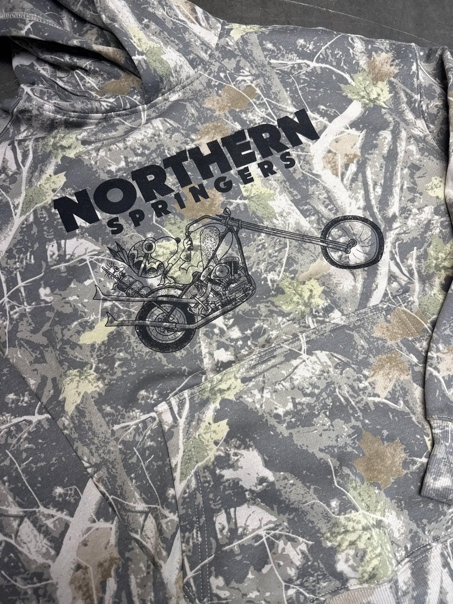 Drawn by @leedennis, out peanuts logo on our hunting camo printed hoodie