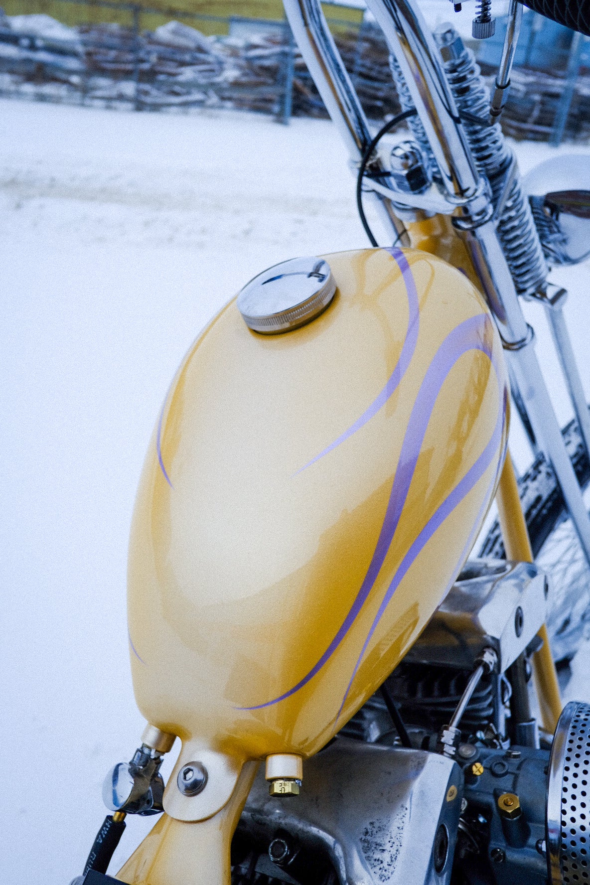 The paint is a beautiful white pebble base with a yellowish/tan overlay, with a light lavender flames. The lighting gives it a different look everytime, paint was done by @vonknobcusrompaints. All the chrome is fresh, thing is is yearning for a new home!